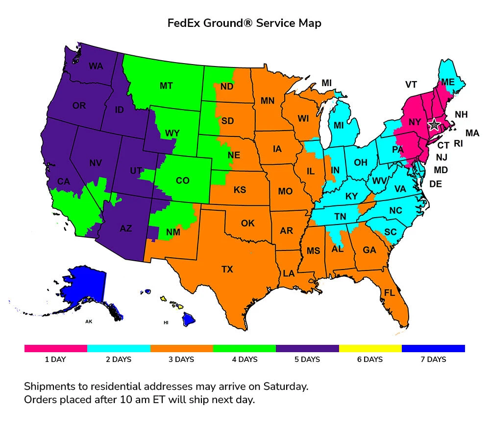 Standard shipping is via FedEx Ground Service for all orders shipping to the U.S. (including Puerto Rico) and Canada. USPS Priority Mail Service will also be an option for shipments to Alaska, Hawaii, Puerto Rico, and U.S. Territories. Shipping charges are calculated automatically based on FedEx real-time shipping rates. Delivery time varies depending upon location and is listed as approximate time in transit once shipped. Please see the map below for estimated timelines. Orders placed after 10 am ET will ship the next business day.