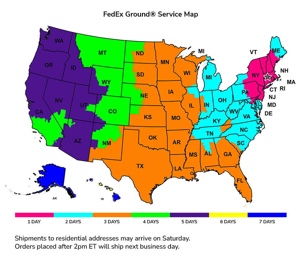 Standard shipping is via FedEx Ground Service for all orders shipping to the U.S. (including Puerto Rico) and Canada. USPS Priority Mail Service will also be an option for shipments to Alaska, Hawaii, Puerto Rico, and U.S. Territories. Shipping charges are calculated automatically based on FedEx real-time shipping rates. Delivery time varies depending upon location and is listed as approximate time in transit once shipped. Please see the map below for estimated timelines. Orders placed after 2pm ET will ship the next business day.